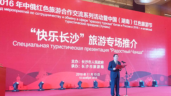 2016年中俄红色旅游合作交流系列活动暨中国(湖南)红色旅游节“快乐长沙”旅游专场推介活动在长沙举行,长沙市副市长陈中致欢迎词